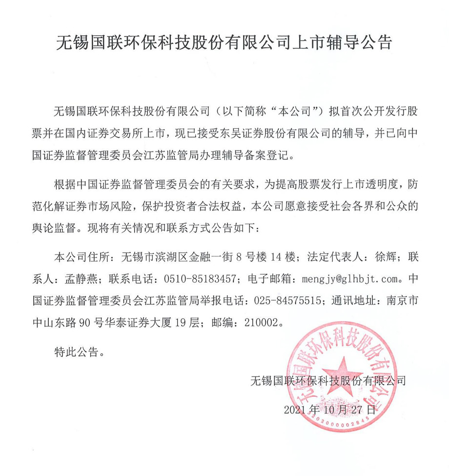無(wú)錫國(guó)聯(lián)環(huán)保科技股份有限公司成立于2011年1月27日,是一家以污泥減量化、無(wú)害化、資源化處置為產(chǎn)業(yè)化發(fā)展的國(guó)有控股企業(yè),股本為109,470,852元。